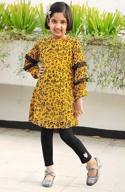 It is made of georgette. It has a unique and trendy style that will suit your princess and give an excellent look. It is also comfortable to wear in any season. Buy it at the best price.
