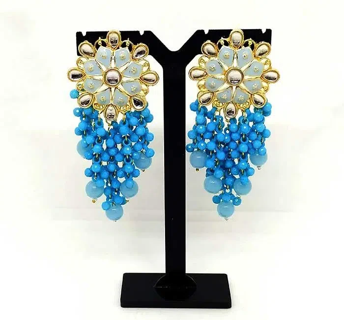 Blue meena earring with kundon & blue moti work.